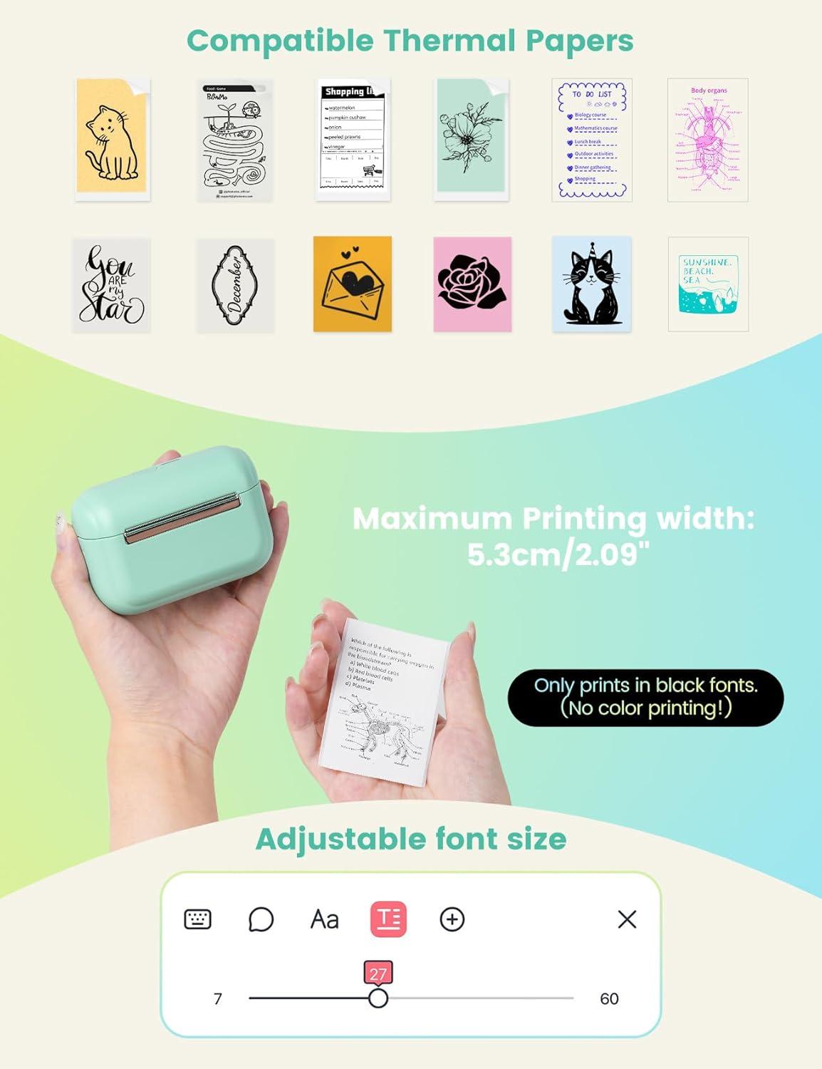 Print Pod Decorative Set : Personalize your items with sticker paper from the mini printer. Ideal for crafting, gift-wrapping, and decorating your office or craft room, it's compatible with over 50 paper colors and styles. Select thermal papers in various color fonts to achieve a range of printing effects. While the mini printer outputs in monochrome, using differently colored papers can create the colorful prints