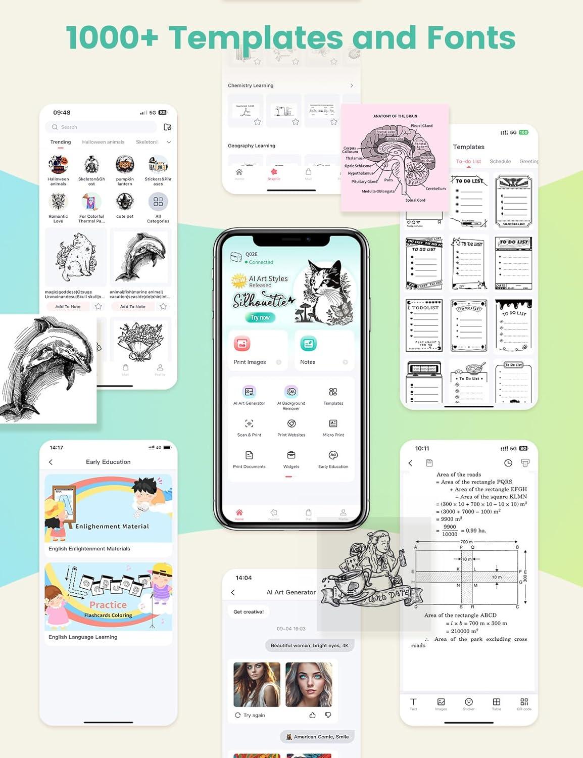 Powerful APP: Enjoy seamless, instant photo and text printing with our thermal sticker printer, compatible with Phomemo APP. Enhance black-and-white images with HD clarity using diverse fonts, filter effects, and customizable themes. Equipped with AI Printing, OCR, and Scan features, this compact device efficiently manages learning, work, and daily tasks. Access a vast library of templates and enjoy regular graphic updates for fresh, creative DIY projects. Perfect for students, professionals, and hobbyists seeking portable, high-quality printing solutions