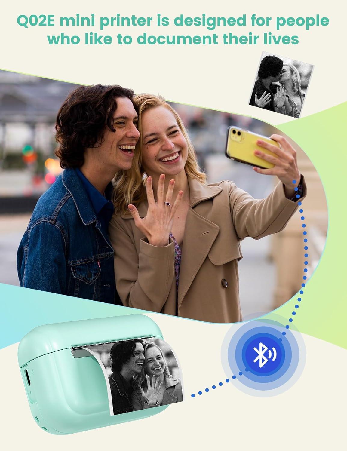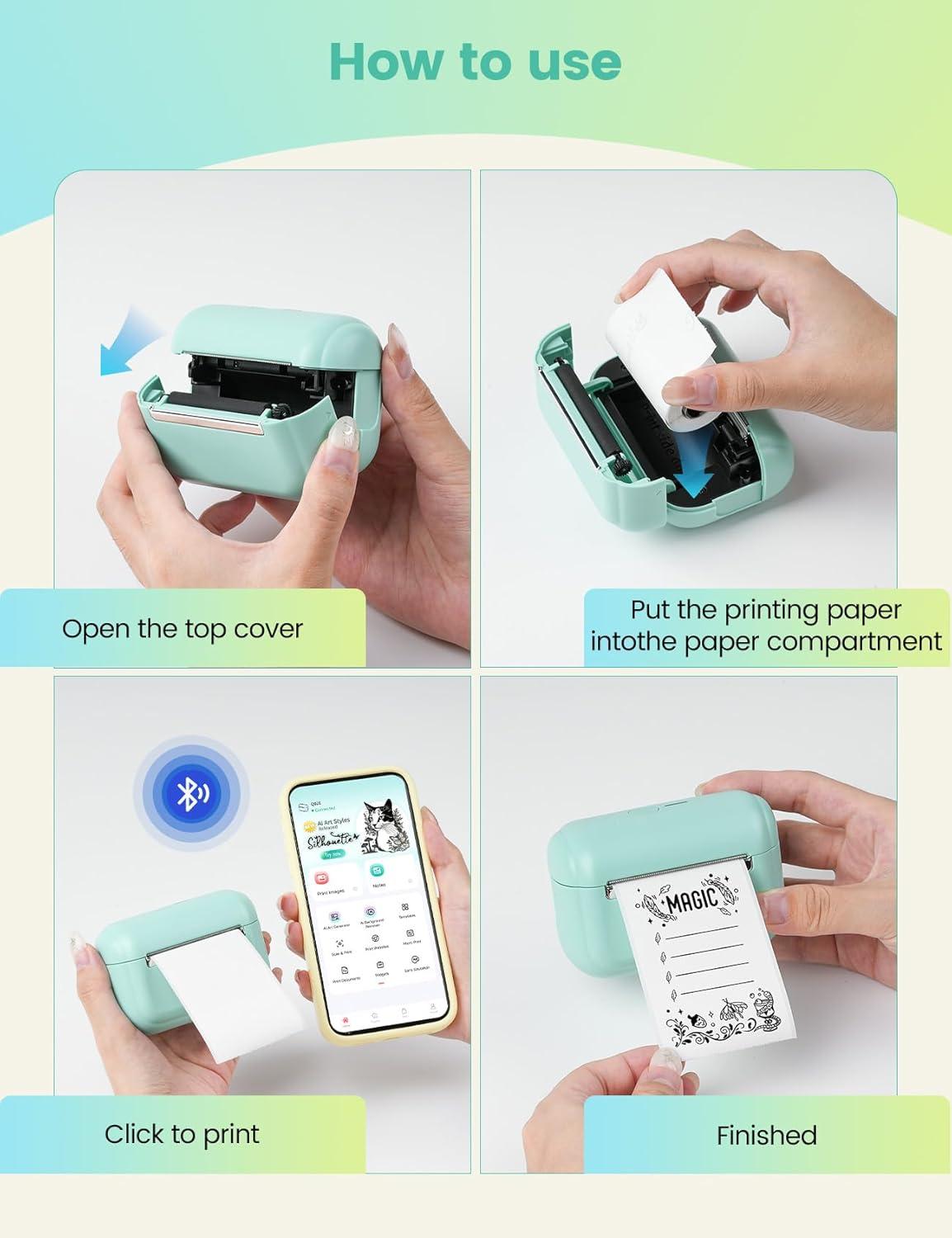 Customized Sticker Printer: Memoking Q02E green mini sticker printer is bundled with 3 rolls of 50mmx3.5m white thermal sticker paper, a USB charging cable, and a user manual. You can use scissors to cut the printed stickers into labels of any shape and size, Meet all your labeling requirements. Our Q02E small printer makes an excellent gift for all festivals such as Brithday, Thanksgiving, Christmas…